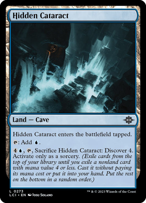 Rarity: L #: 273 Creature Type or Sub Type: Land — Cave Rules Text Contains: Hidden Cataract enters the battlefield tapped. T: Add U. 4U...