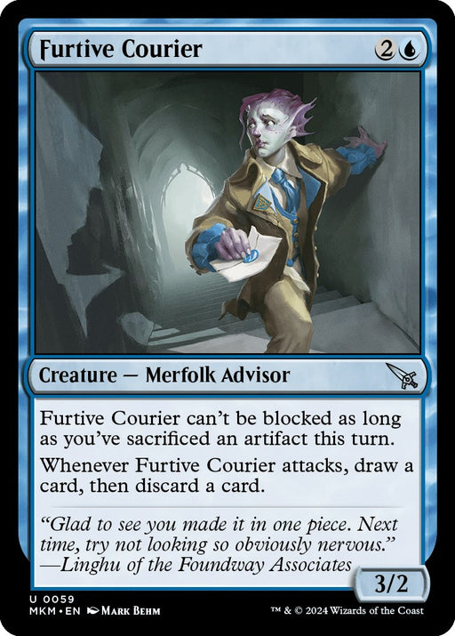 Rarity: U #: 59 Creature Type or Sub Type: Creature — Merfolk Advisor P: 3 T: 2 Rules Text Contains: Furtive Courier can't be blocked as lon...