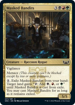 Rarity: C #: 319 Creature Type or Sub Type: Creature — Raccoon Rogue P: 5 T: 5 Rules Text Contains: Vigilance, menace 2, Exile Masked Bandi...