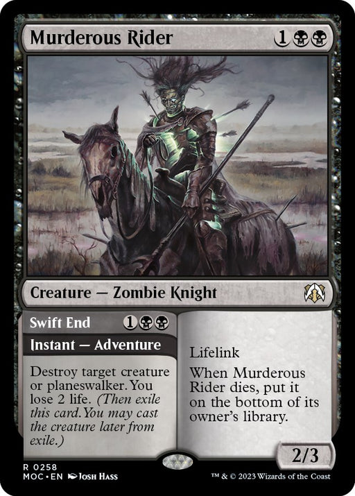 Rarity: R #: 258 Creature Type or Sub Type: Creature — Zombie Knight P: 2 T: 3 Rules Text Contains: Lifelink When Murderous Rider dies, put...