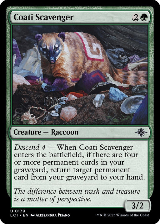 Rarity: U #: 179 Creature Type or Sub Type: Creature — Raccoon P: 3 T: 2 Rules Text Contains: Descend 4 — When Coati Scavenger enters the ba...