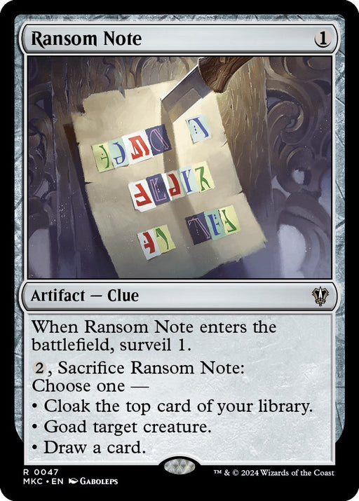 Rarity: R #: 47 Creature Type or Sub Type: Artifact — Clue Rules Text Contains: When Ransom Note enters the battlefield, surveil 1. 2, Sacr...