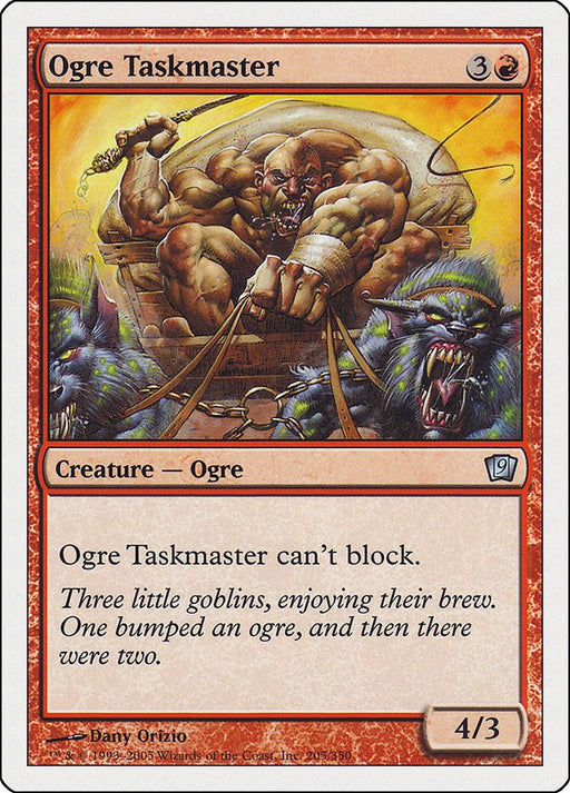 Rarity: U #: 205 Creature Type or Sub Type: Creature — Ogre P: 4 T: 3 Rules Text Contains: Ogre Taskmaster can’t block. Flavor: Three littl...