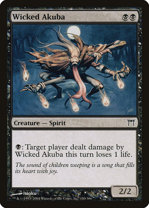Rarity: C #: 150 Creature Type or Sub Type: Creature — Spirit P: 2 T: 2 Rules Text Contains: B: Target player dealt damage by Wicked Akuba t...