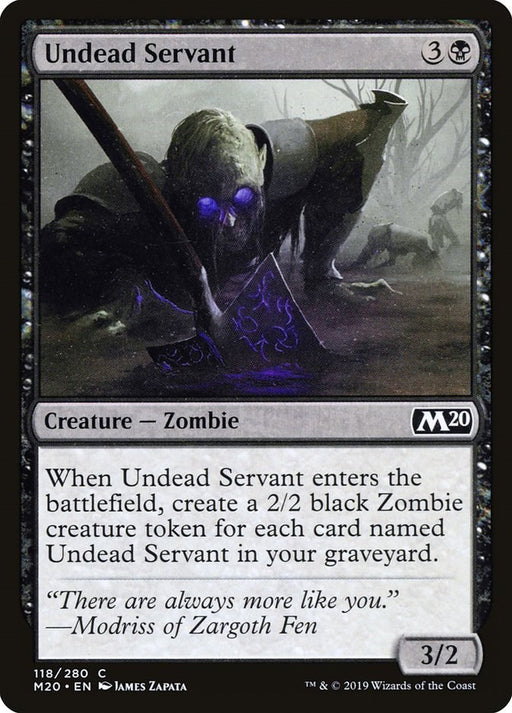 Rarity: C #: 118 Creature Type or Sub Type: Creature — Zombie P: 3 T: 2 Rules Text Contains: When Undead Servant enters the battlefield, cre...