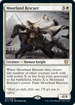 Rarity: R #: 7 Creature Type or Sub Type: Creature — Human Knight P: 4 T: 4 Rules Text Contains: When Moorland Rescuer dies, return any numb...