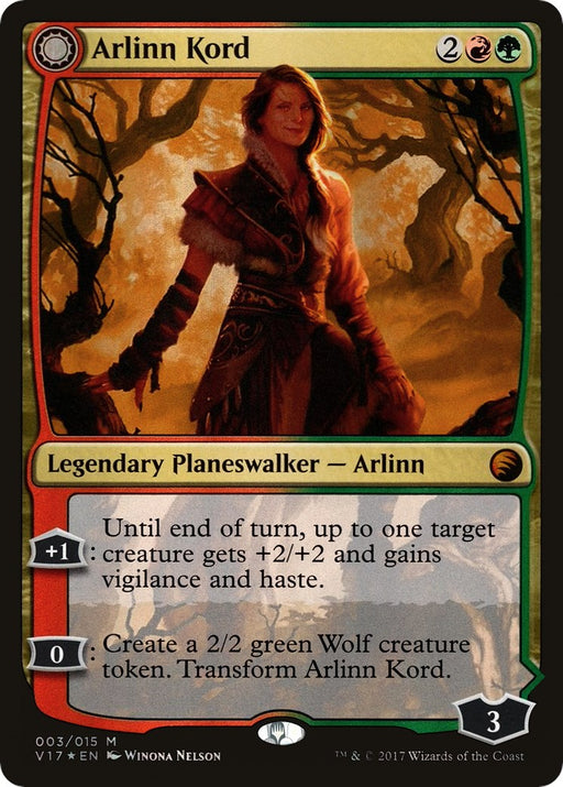 Rarity: M #: 3 Creature Type or Sub Type: Legendary Planeswalker — Arlinn Rules Text Contains: [+1]: Until end of turn, up to one target creat...