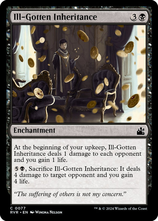 Rarity: C #: 77 Creature Type or Sub Type: Enchantment Rules Text Contains: At the beginning of your upkeep, Ill-Gotten Inheritance deals 1 da...