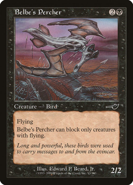Rarity: C #: 53 Creature Type or Sub Type: Creature — Bird P: 2 T: 2 Rules Text Contains: Flying Belbe’s Percher can block only creatures...